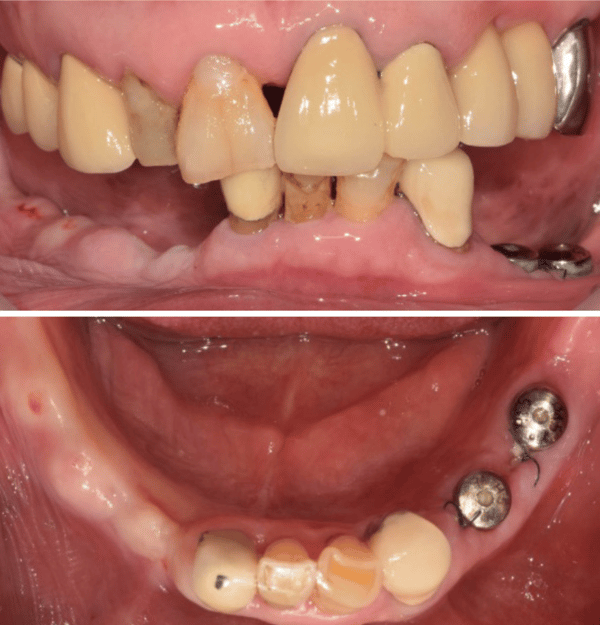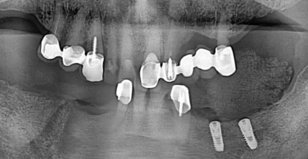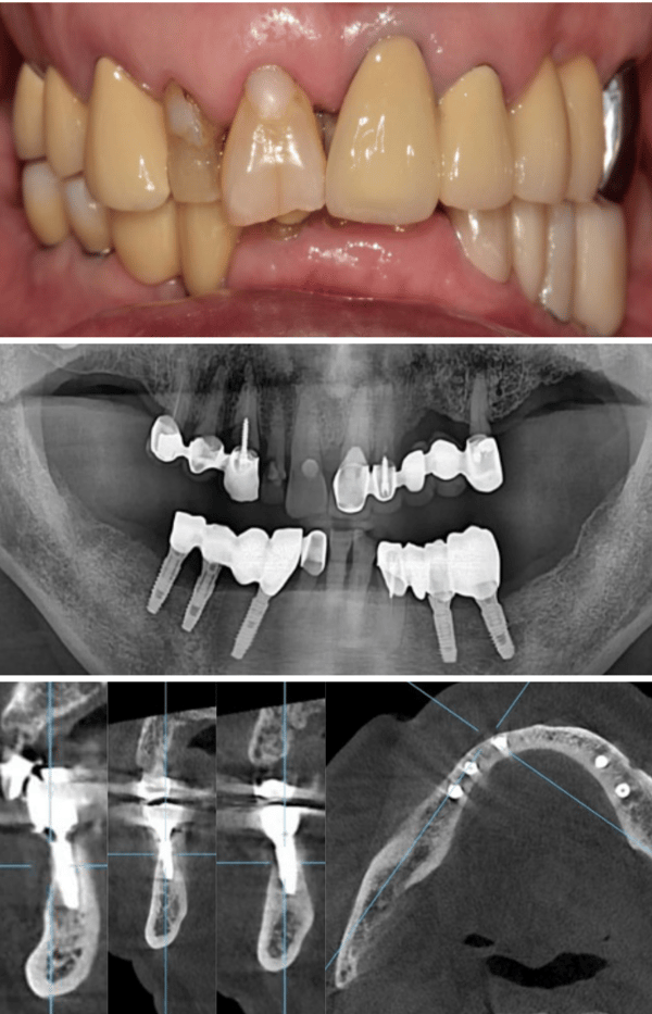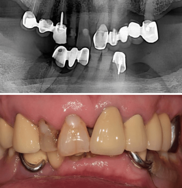 一位長期受牙齒問題困擾的病患走進了診間,他的下顎依賴著一副活動局部假牙維持僅存的咀嚼功能,而右下側的牙橋邊緣已出現繼發性齲齒,多顆牙齒根尖甚至出現病變。對於任何一位經驗豐富的醫師來說,這都是一個棘手的開局。病患渴望植牙,但他提出了一個令許多醫師頭痛的要求:受限於經濟與社交需求,他不願意拔除所有患牙,更不願意在漫長的治療期間經歷無牙的尷尬期。