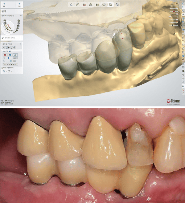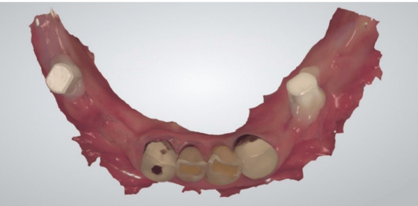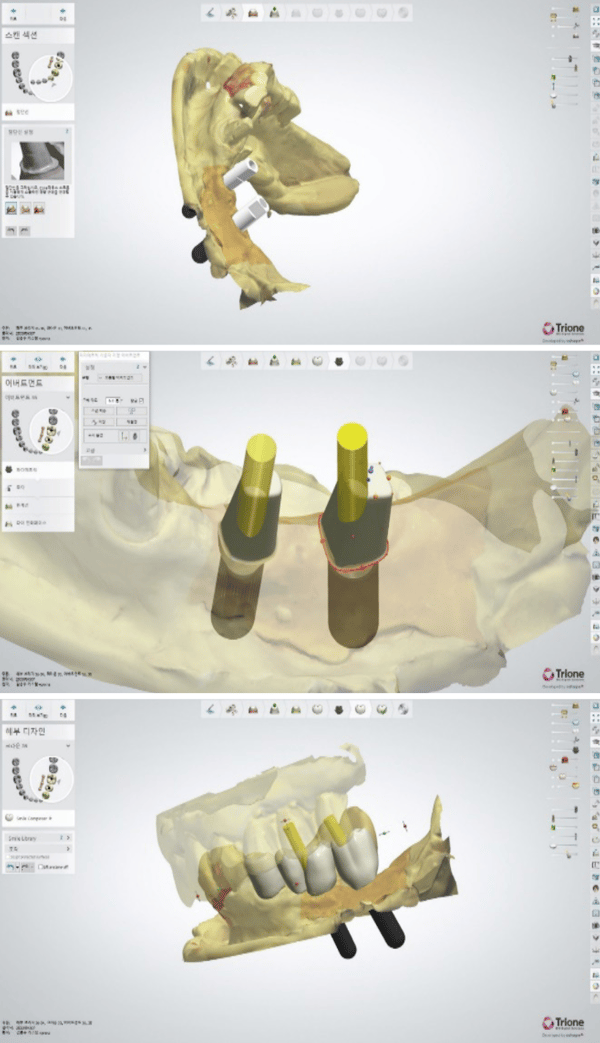 在數位化介入之前,你可能需要花費大量時間與技工所溝通,反覆進行藻膠印模來確認咬合垂直高度。Jaemin Lee 醫師最初制定了一個穩健的兩階段計畫:先處理左下顎的植牙,保留右側牙橋與 RPD 作為過渡。這是一個合理的打法,透過數位掃描記錄下初始的咬合狀態與軟組織型態,為這場長跑做好了準備。這時,數位檔案就像是一個精準的時空膠囊,完整保存了病患未經破壞前的口腔資訊,這在後續的突發狀況中發揮了決定性的作用。